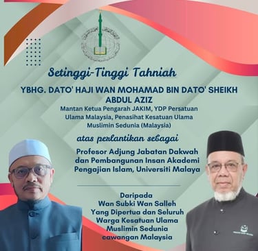 قام الاتحاد العالمي لعلماء المسلمين فرع ماليزيا بزيارة رسمية إلى مكتب معالي وزير في رئاسة مجلس الوزراء (للشؤون الدينية) السيناتور داتو’ سِتيا الدكتور الحاج محمد نعيم حاج مختار، وذلك بتاريخ ١٥ يوليو ٢٠٢٥ في بوتراجايا.