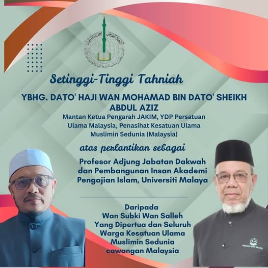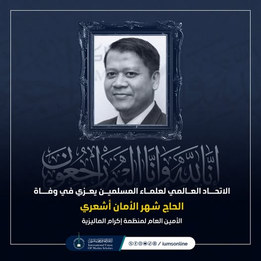Dengan penuh keimanan terhadap qada’ dan qadar Allah, serta hati yang sarat dengan kesedihan dan rasa kehilangan, Kesatuan Ulama Muslimin Sedunia merakamkan ucapan takziah kepada umat Islam dan rakyat Malaysia yang dikasihi atas pemergian Almarhum Haji Shahr Aman Asy'ari, Setiausaha Agung Pertubuhan IKRAM Malaysia, yang telah kembali ke rahmatullah pada pagi Isnin, 30 Syawal 1446H bersamaan 28 April 2025M, di Institut Kanser Negara (IKN).