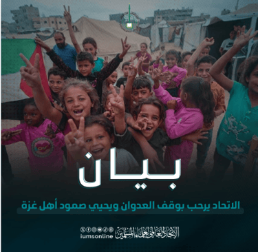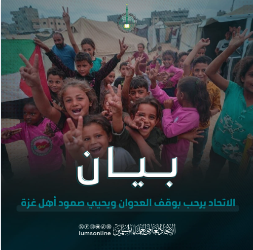 Kesatuan Ulama Muslim Sedunia menyambut baik penghentian serangan terhadap Gaza, sambil mengucapkan setinggi-tinggi penghargaan kepada semua pihak yang telah berperanan dalam merealisasikannya, serta menzahirkan rasa bangga dan penghormatan terhadap ketabahan dan keteguhan penduduk Gaza yang mulia atas kesabaran dan kecekalan mereka.